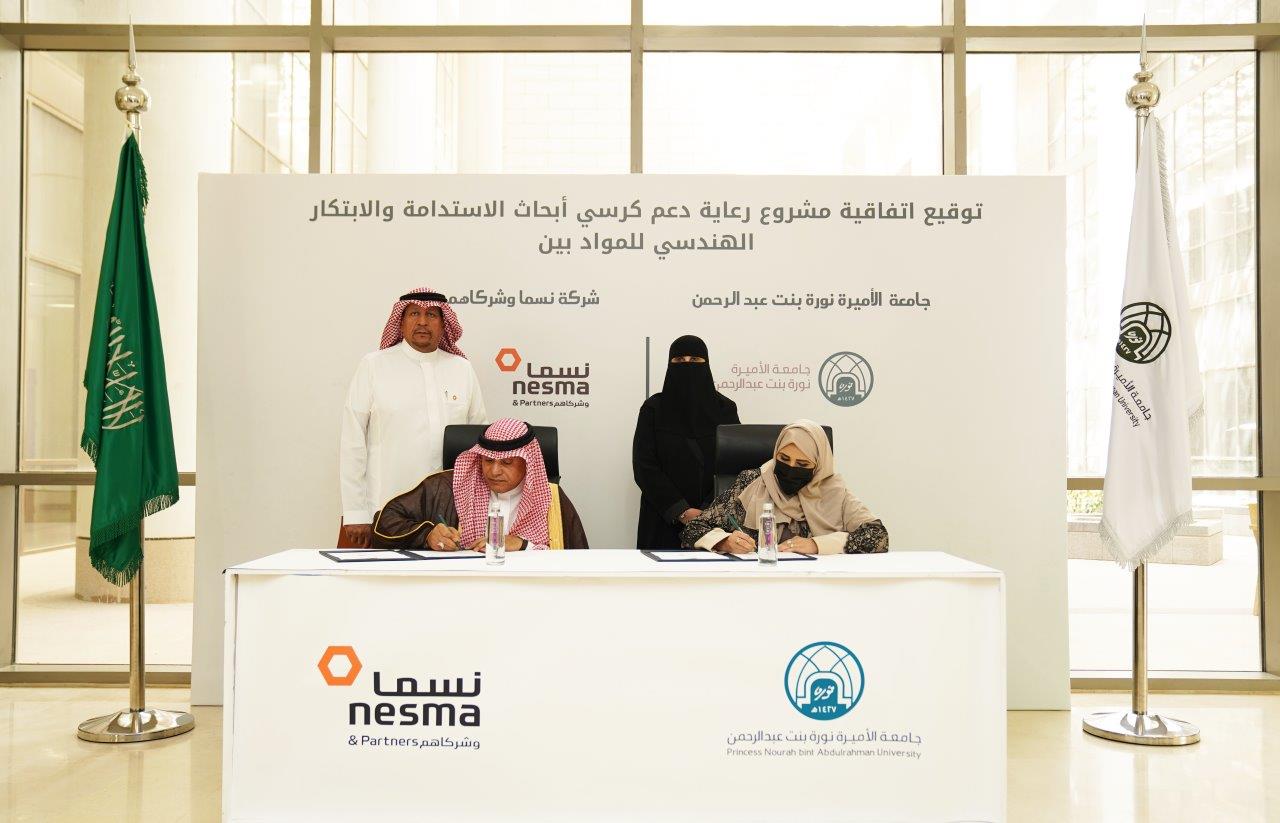 بناءً على مذكرة تفاهم للبحث والتطوير وُقعت في وقت سابق هذا العام مع كلية الهندسة في جامعة الأميرة نورة بنت عبد الرحمن، أبرمت شركة نسما وشركاهم، وجامعة الأميرة نورة بنت عبد الرحمن، اتفاقية مشروع "رعاية دعم كرسي أبحاث الاستدامة والابتكار الهندسي للمواد"، وذلك بحضور سعادة رئيسة الجامعة المكلَّفة، الدكتورة فوزية بنت سليمان العمرو، في مقر مركز أبحاث العلوم الطبيعية والصحية بالجامعة.